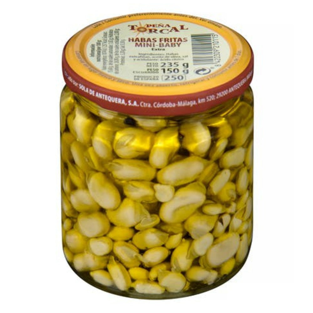 Ces petites fèves espagnoles, également connues sous le nom de Habas Fritas Baby, sont une tapa appréciée en Andalousie, souvent servie avec des morceaux de Jamon Serrano ou de Jamon Ibérico grillés. Les fèves proviennent de la région d'Antequera, au nord de Malaga, et sont légèrement frites dans de l'huile d'olive extra vierge par la société Peña Torcal.