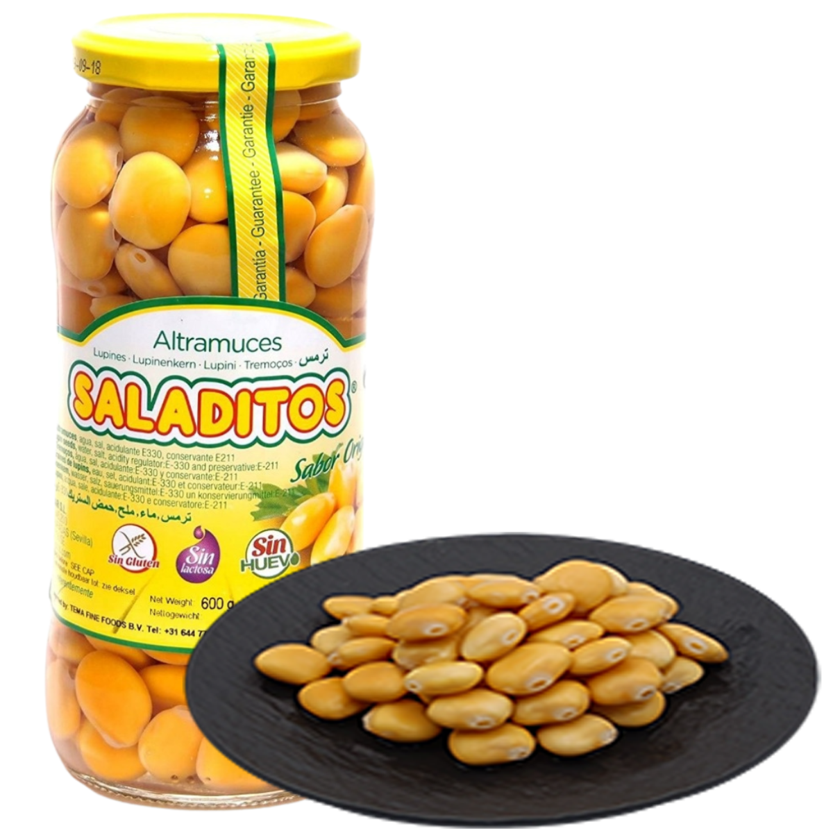Altramuces, également connus sous le nom de haricots de lupin, sont riches en protéines, en fibres et en divers nutriments. Ils peuvent être ajoutés aux salades, aux ragoûts ou consommés en collation. Pot en verre de 600 g.