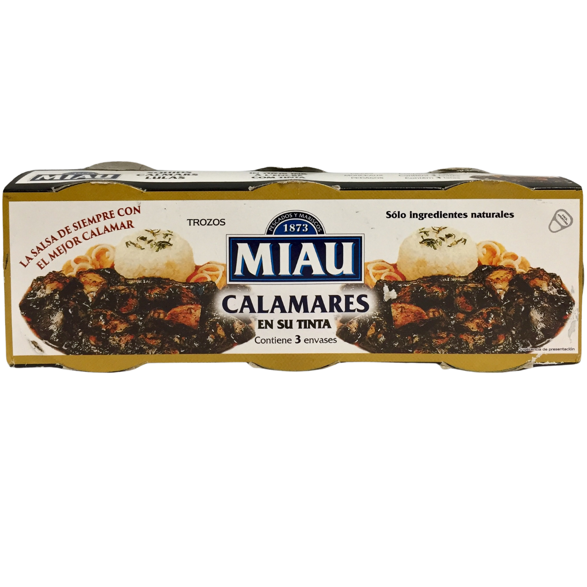 Miau Calamar en su Tinta, délice espagnol pour les amateurs de fruits de mer. Préparé selon la tradition espagnole avec des calmars dans leur encre. 3 boîtes de 85g, parfaites en apéritif ou avec du riz Brillante. Une expérience gustative authentique.