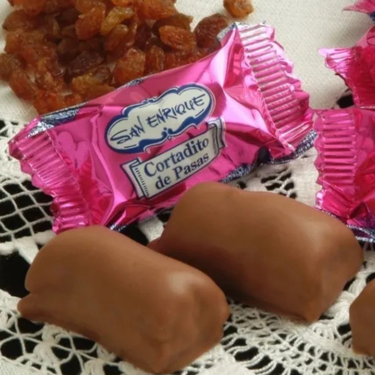 Type : petits carrés aux raisins, enrobés de chocolat (Estepa)