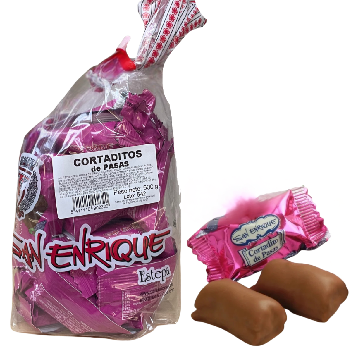 Cortaditos de Pasas San Enrique (Estepa) : petits carrés friables aux raisins de Corinthe, enrobés de chocolat. Sachet 500 g — parfaits avec le café.