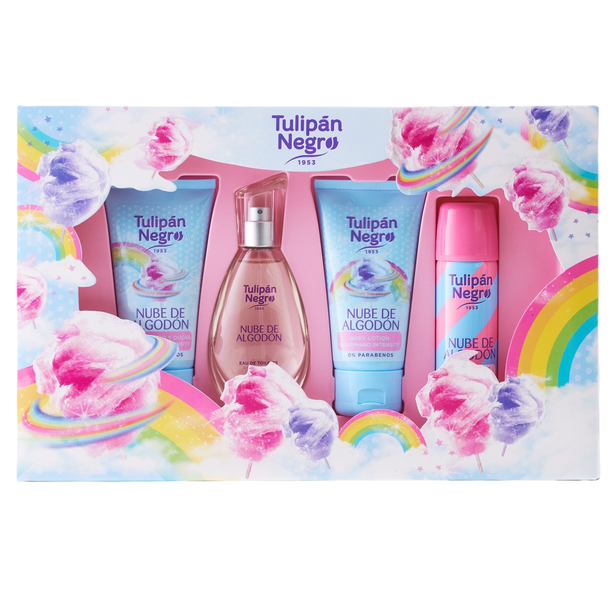 Envie d’un nuage sucré sur ta peau ? Ce coffret Tulipán Black Nube de Algodón (gel douche, lait corps, déo, parfum) t’enveloppe dans une douce odeur de barbe à papa.