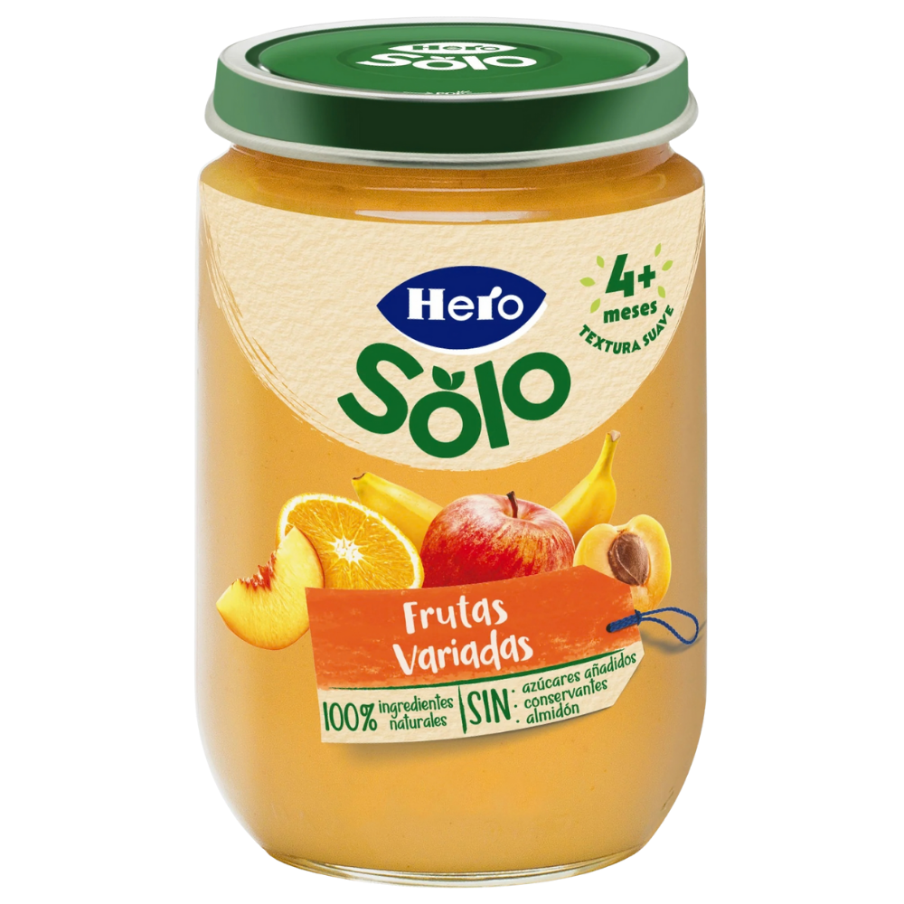 Hero Solo "Frutas Variadas" is een gemengde fruitpuree in potje, gemaakt met appel, peer, banaan en sinaasappel. Bereid zoals thuis: fruit selecteren, koken en vacuüm verpakken met een warmtebehandeling, zodat het bewaard kan worden zonder conserveermiddelen of toegevoegde suikers.