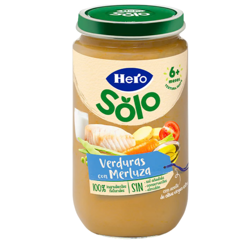 Hero Solo "Verduras con Merluza" is een complete vis-groente maaltijd in potje, gemaakt met verse heek (witte vis) en een mix van groenten. Bereid zoals thuis: ingrediënten selecteren, koken en vacuüm verpakken met een warmtebehandeling, zodat het bewaard kan worden zonder conserveermiddelen of kleurstoffen.