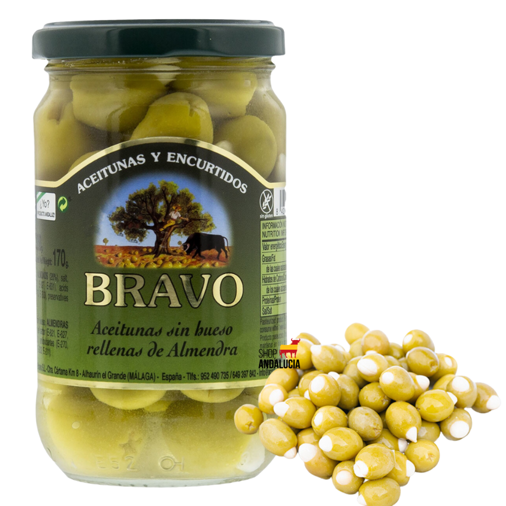 Bravo Manzanilla olijven gevuld met amandel, een perfecte combinatie van sappige Manzanilla-olijven en knapperige amandelen. Deze delicatesse biedt een harmonieuze mix van zoutige en nootachtige tonen, waardoor elke hap een verrukkelijke ervaring wordt.