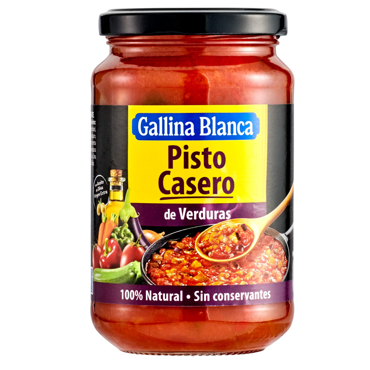 Ontdek de heerlijke smaak van Gallina Blanca Pisto Casero Verduras, een authentiek Spaans gerecht boordevol smaakvolle ingrediënten. Onze huisgemaakte groentestoofpot bevat een harmonieuze mix van tomaten, uien, paprika's, courgettes en meer, allemaal zorgvuldig bereid en verpakt in een glazen pot van 350 g netto.